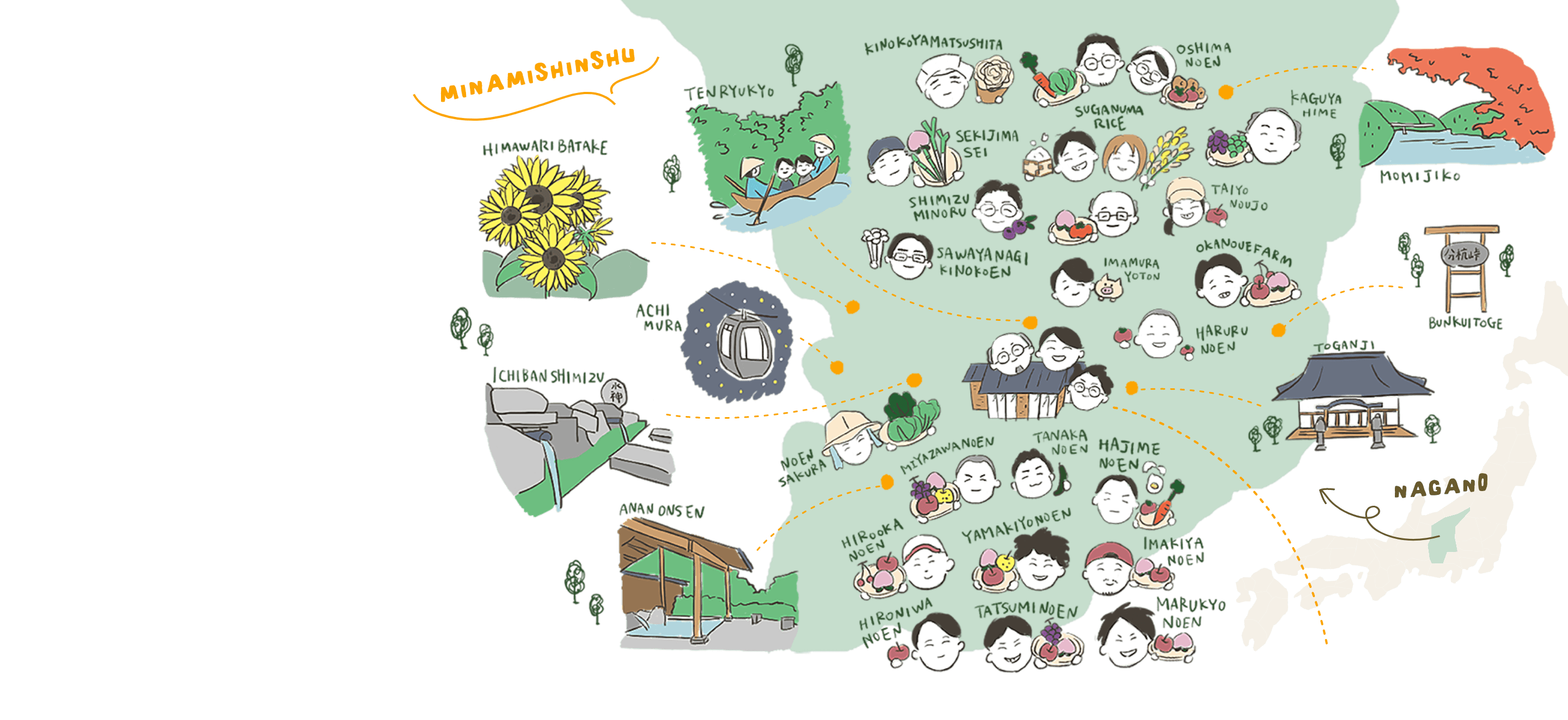南信州でさまざまな農作物が収穫できるのは、標高差のある土地と恵まれた気象条件が揃っているから。この地で収穫された彩り豊かな農作物と、素材の味を生かした手作り加工品を販売しています。 -