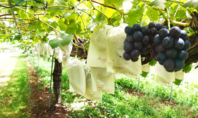 大粒で甘さが凝縮されたナガノパープルが出来るまでの道のりは決して簡単なものではありません。冬から栽培を開始し、6月頃に房の大きさが決まる間引き(芽かき)を行います。7月には房に残す粒の数を決め、余分な粒は手作業で1つずつハサミで切り落とします。これにより甘さが凝縮されたぶどうが出来上がります♪その後、雨や日を避ける傘を1つづつ房ごとに掛け、8月下旬の収穫に至ります。