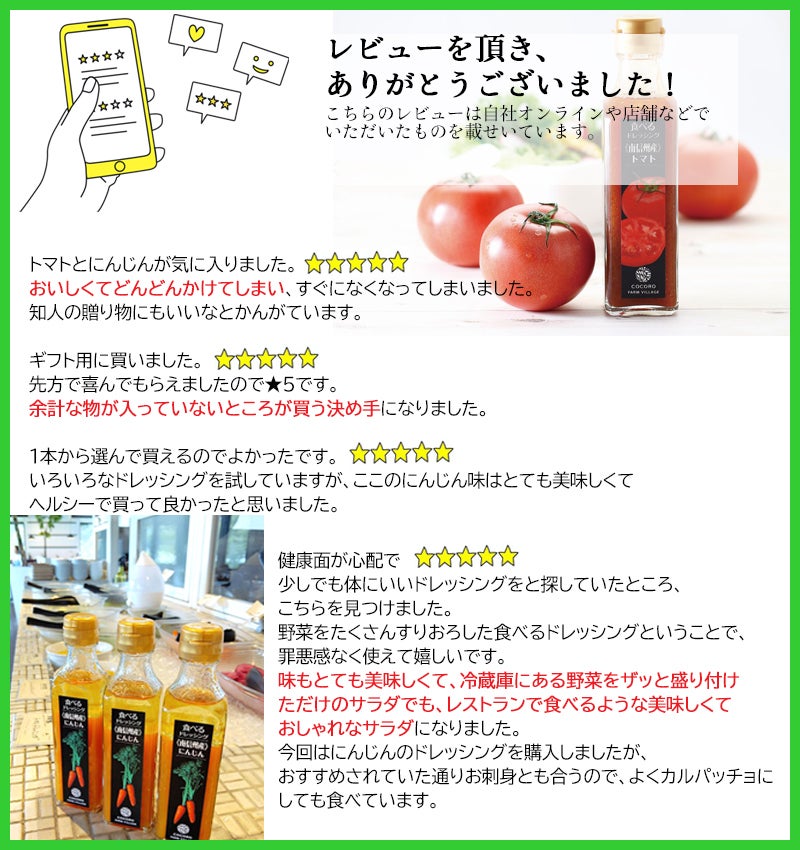 レストランのシェフが考案したココロファームビレッジオリジナルの「食べるドレッシング」の3種の味を体験できるセットです。 地元の素材をふんだんに使用し、油分は控えめに作られています。 約4分の3がすりおろした素材という「食べるドレッシング」なので、サラダばかりではなく、バケットに乗せてディップにしてみたり、焼いたお肉やお魚のソースにしたり、幅広い用途で活躍します!