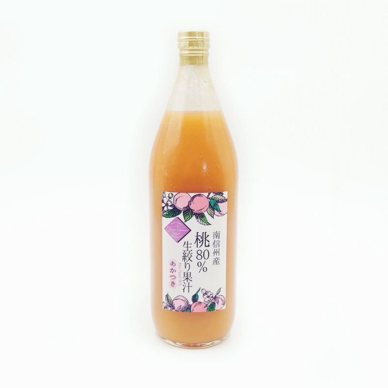南信州飯田で収穫された桃「あかつき」を使用したジュースです。 完熟した桃を絞って作るジュースは100%の場合、トロミがつきすぎて瓶からスムーズに出て来ないほどトロンとしています。