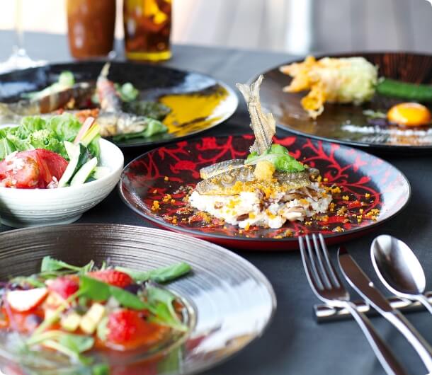 南信州の農産物と生産者の特長を知り尽くしたイタリアンシェフ中村彰利が洗練された南信州料理を提供いたします。旬の素材を生かした創作料理を、庭園が一望できる癒しの空間でゆったりとお食事いただけます。