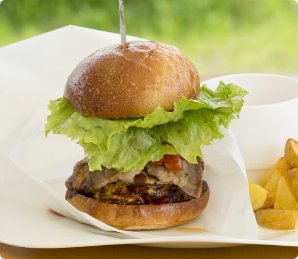 南信州牛・豚肉の合挽を使用したハンバーグは、150gの大ボリューム!挟み込むのは、こだわりの天龍黒豚を燻製にしたオリジナルベーコン、そして南信州の美味しさ満点の野菜たち。