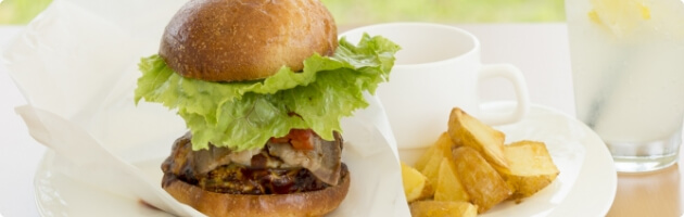 バーガーカフェで大人気なのが天龍峡名物ココロバーガー!シェフこだわりの自家製全粒粉バンズの下には、天龍峡黒豚ベーコンと南信州牛と豚肉の合い挽き肉を使ったパテ、そこに南信州産の新鮮野菜たちをたっぷり挟みこみました♪