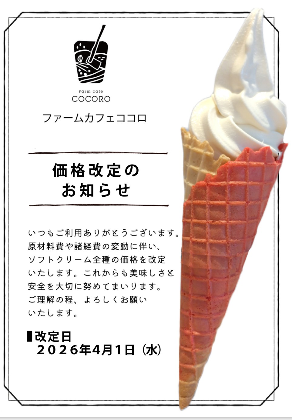 誠に勝手ながらファームカフェココロにて販売中のソフトクリームの価格を2026年4月1日より改定させて頂きます。
