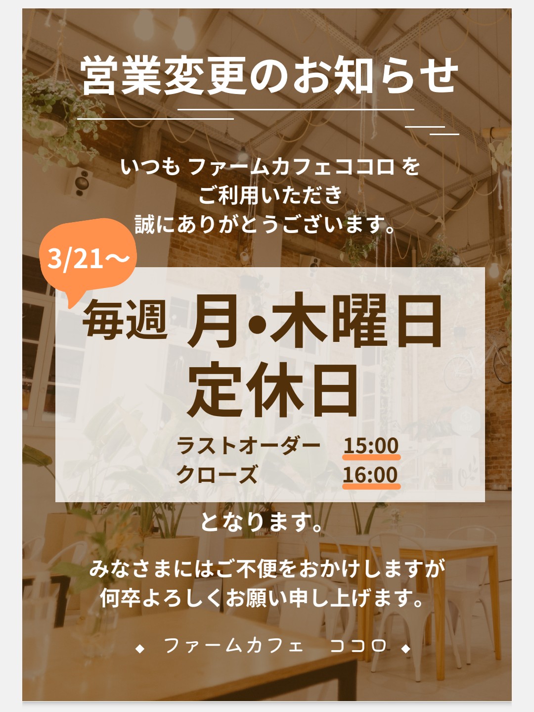 3月21日よりファームカフェココロの営業時間変更と定休日設定をさせて頂きます。